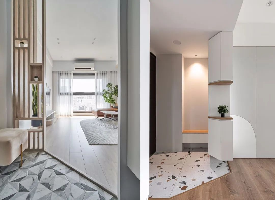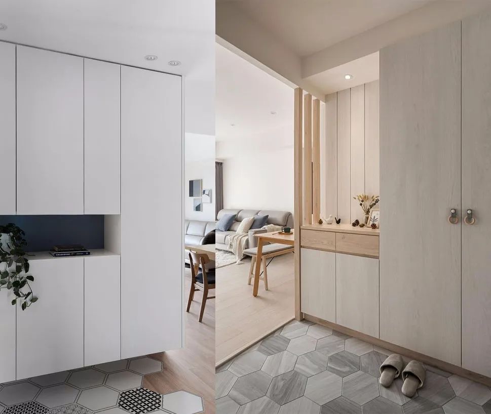 可以在玄關(guān)處鋪設(shè)瓷磚,如果是全屋通鋪木地板,那么在入戶的位置鋪貼六邊形的花磚,可以和地板收口拼接。既方便打掃清理,又有很高的顏值,還能起到劃分空間的作用。