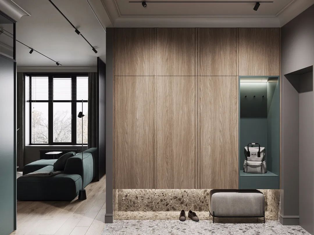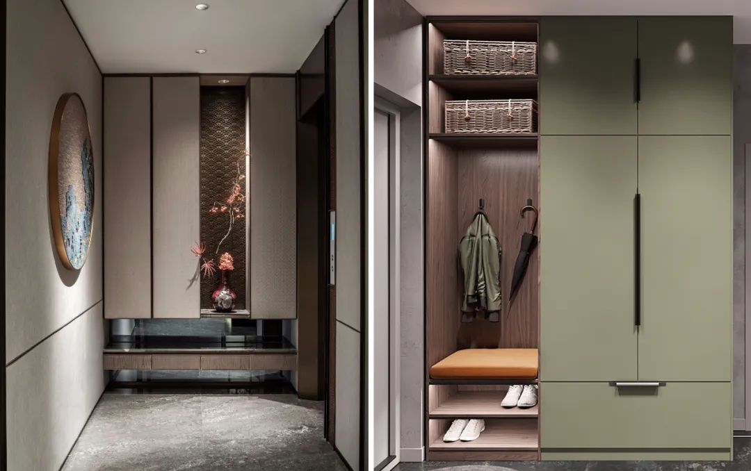 玄關(guān)柜要做到頂,否則頂部非常容易積灰難以打掃清理,另一方面,底部抬高懸空,用來滿足“懶人踢”的功能,平時(shí)經(jīng)常會(huì)更換的鞋子就可以脫下放在里面,不用再把鞋子放到鞋柜里。如果沒有設(shè)置底部太高,那么進(jìn)門常更換的鞋子堆滿一地,亂七八糟。